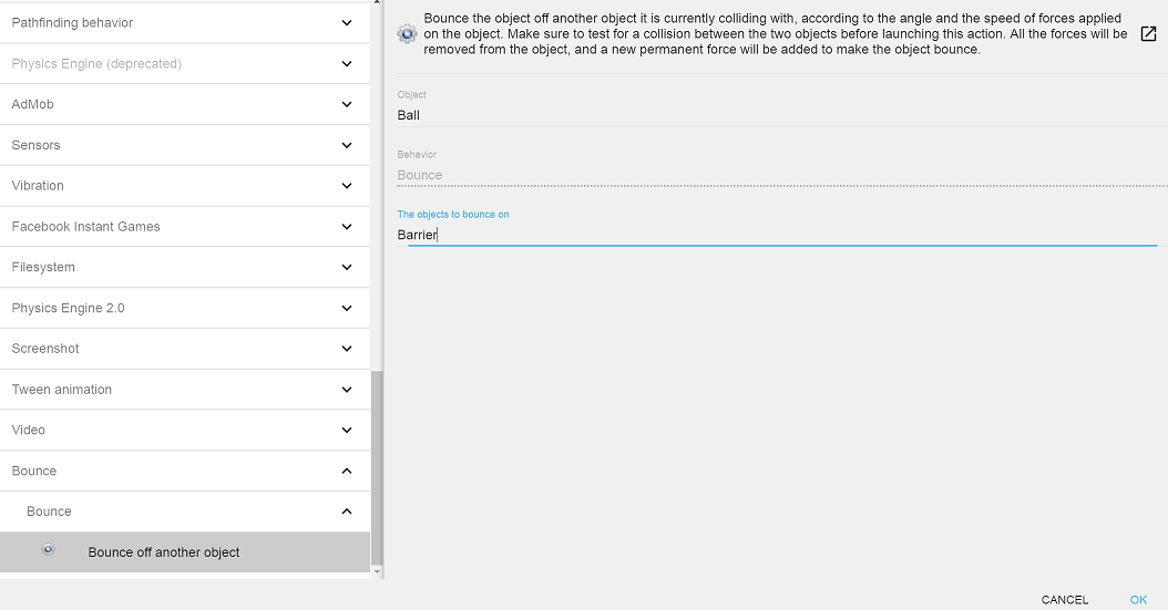• Click Common actions for all objects > Movement > Add a force (angle).